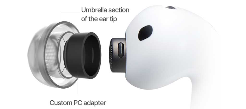 イヤーピースとアダプター構造を一体化し、イヤーピースがアダプター部を包み込む形状で保持力を確保。外れを抑え、密閉性の安定化を図ります。