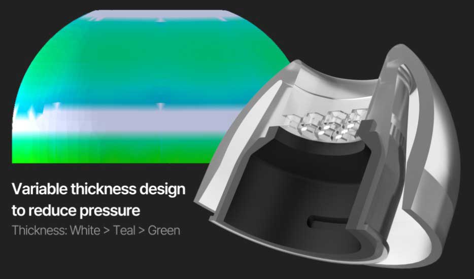 均一厚のイヤーピースと異なり、テーパード形状は挿入がスムーズになり、快適性と密閉性能の両方を高めます。可変厚設計では、傘部の外耳側の一部まで厚みを調整可能とし、耳内圧を低減しつつ、外部騒音の遮断性を高めます。